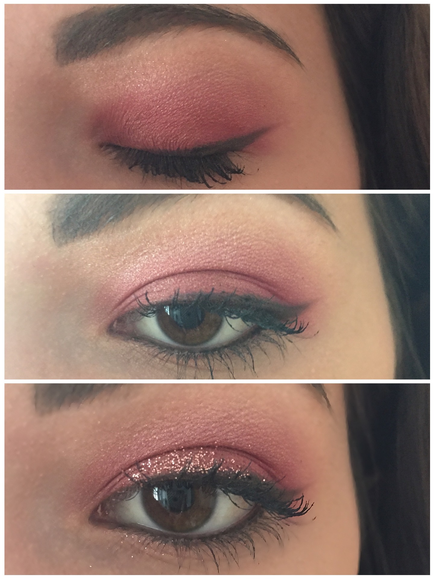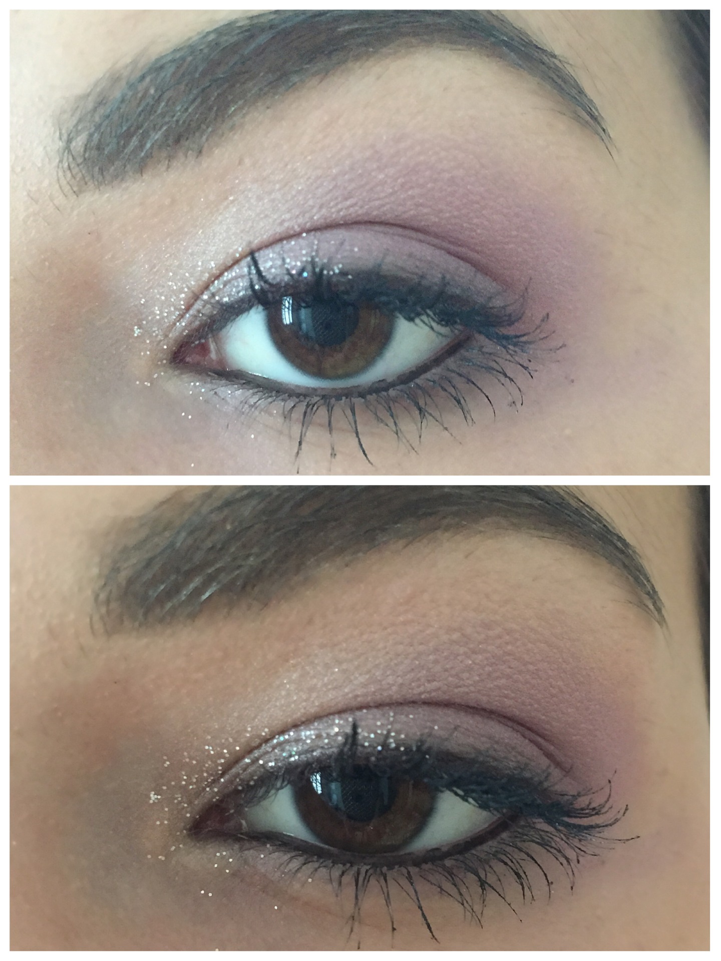 DOPO AVER APPLICATO IL PRIMER E IL CORRETTORE, HO STESO IL COLORE VIOLA DELLE PALETTE MAKERS GLITTER & EYESHADOW SU TUTTA LA PALPEBRA MOBILE. L' HO SFUMATO CON IL COLORE ROSA CHIARO DELLA STESSA PALETTE, MA SOLO SULL' ANGOLO INTERNO DELL'OCCHIO. NELL' ARCATA SOPRACCIGLIARE HO STESO IL COLORE "ANGELIC" DELLA PALETTE DI SEPHORA. HO APPLICATO LA MATITA SOTTO E POI SOPRA, SFUMANDOLA COME SE FOSSE UN EYELINER. CON UN PENNELLINO HO AGGIUNTO I GLITTER DEL COLORE ROSA CHIARO ED INFINE HO APPLICATO IL MASCARA!
