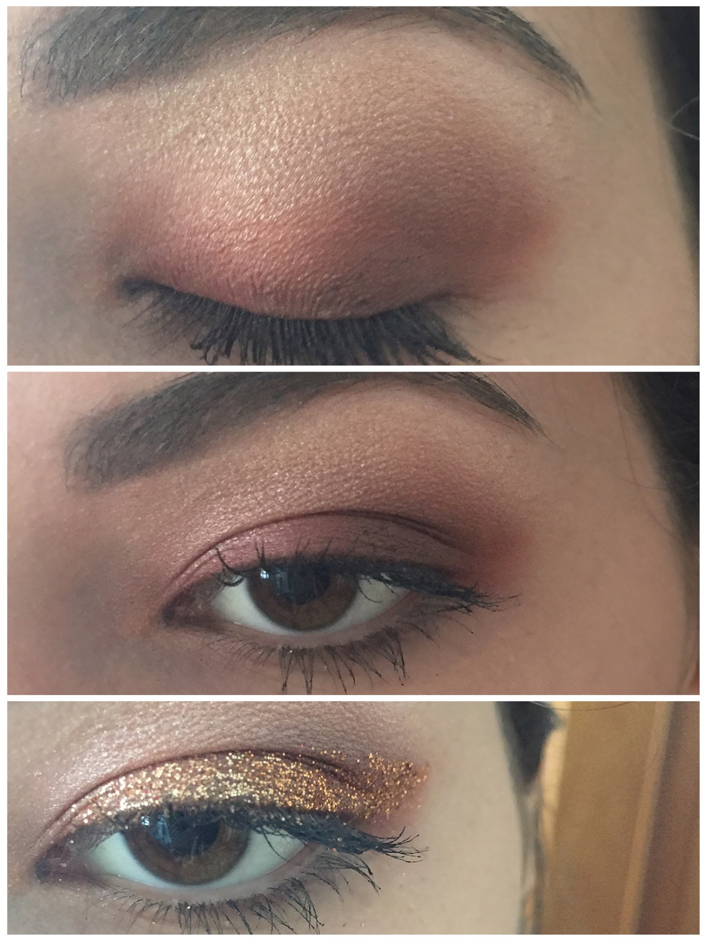 DOPO AVER STESO PRIMER E CORRETTORE, HO SFUMATO I DUE MARRONI SULLA PALPEBRA MOBILE, QUELLO PIU' CHIARO VERSO L'INTERNO E QUELLO PIU' SCURO VERSO L'ESTERNO. HO APPLICATO DELL'OMBRETTO ILLUMINANTE SOTTO L'ARCATA SOPRACCIGLIARE, INFINE HO APPLICATO I BRILLANTINI: QUELLI ORO CHIARO VERSO L'INTERNO, QUELLI ORO SCURO VERSO L'ESTERNO CERCANDO DI DARE LA FORMA DI EYELINER. PER FINIRE HO AGGIUNTO IL MASCARA!